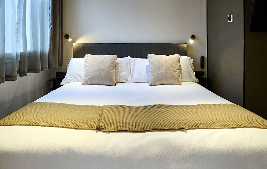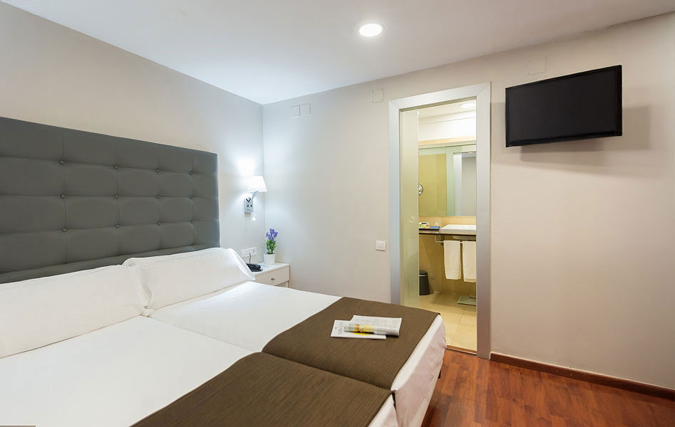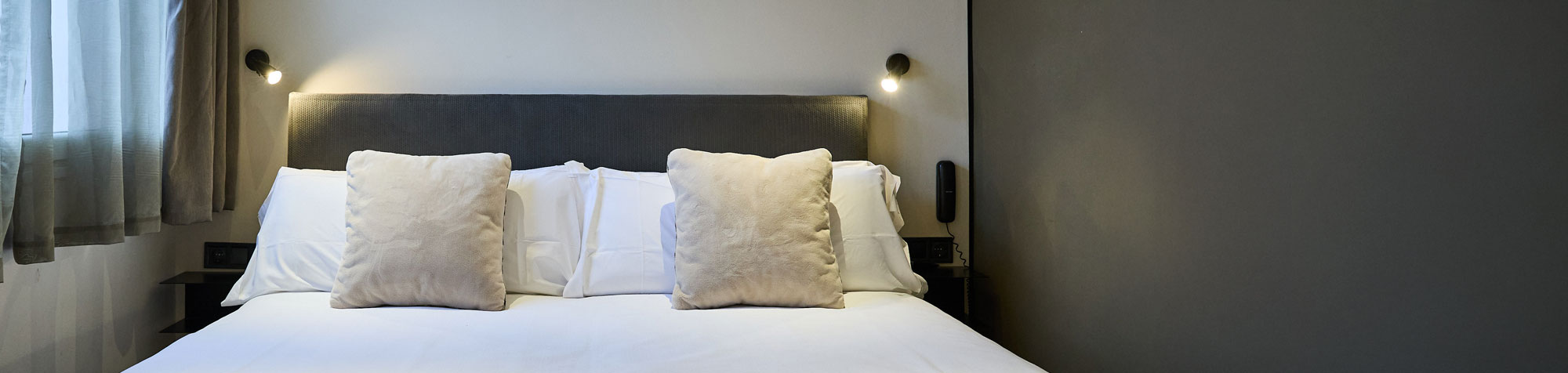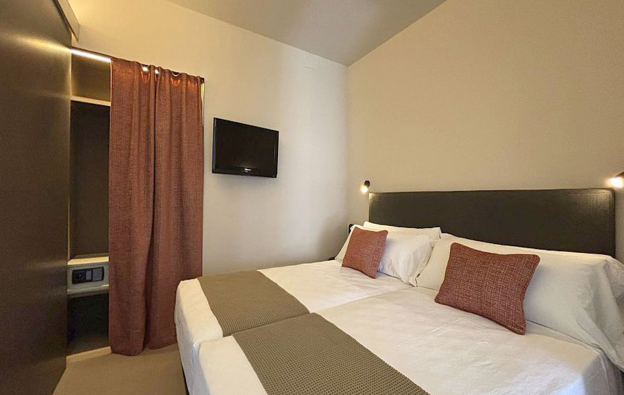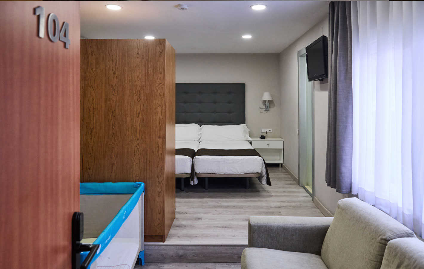Nuestros renovados apartamentos superiores tienen capacidad para 4 personas, ya bien sean adultos o adultos con niños. Tiene una habitación privada para 2 personas (2 camas individuales o 1 cama de matrimonio bajo petición) con armario empotrado y TV. Baño completo con ducha y con acceso desde el pasillo. Salón con sofá cama desplegable, TV y cocina totalmente equipada. Se accede a ellos por ascensor.