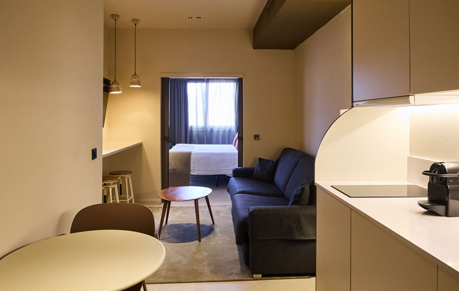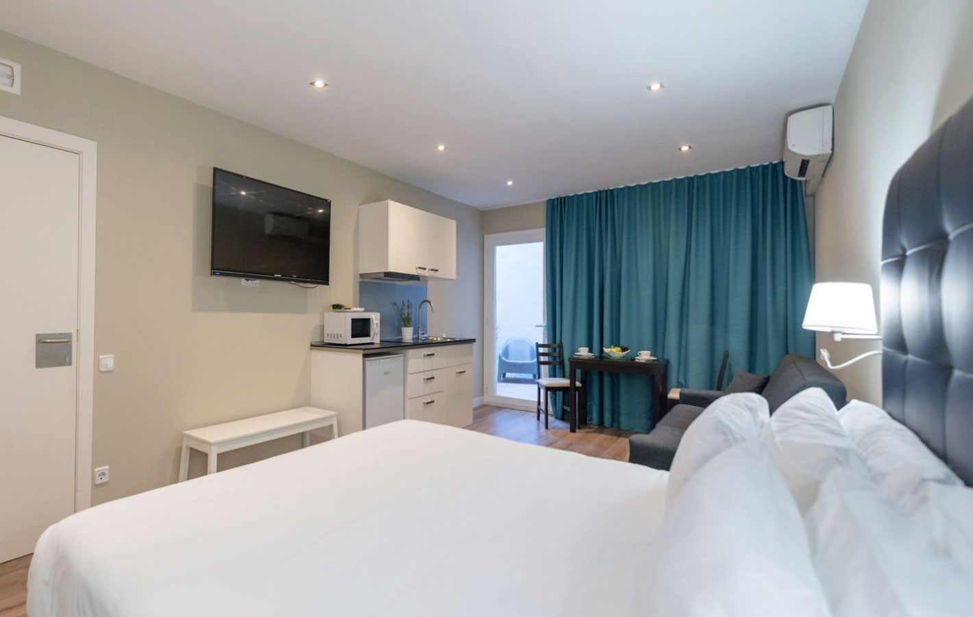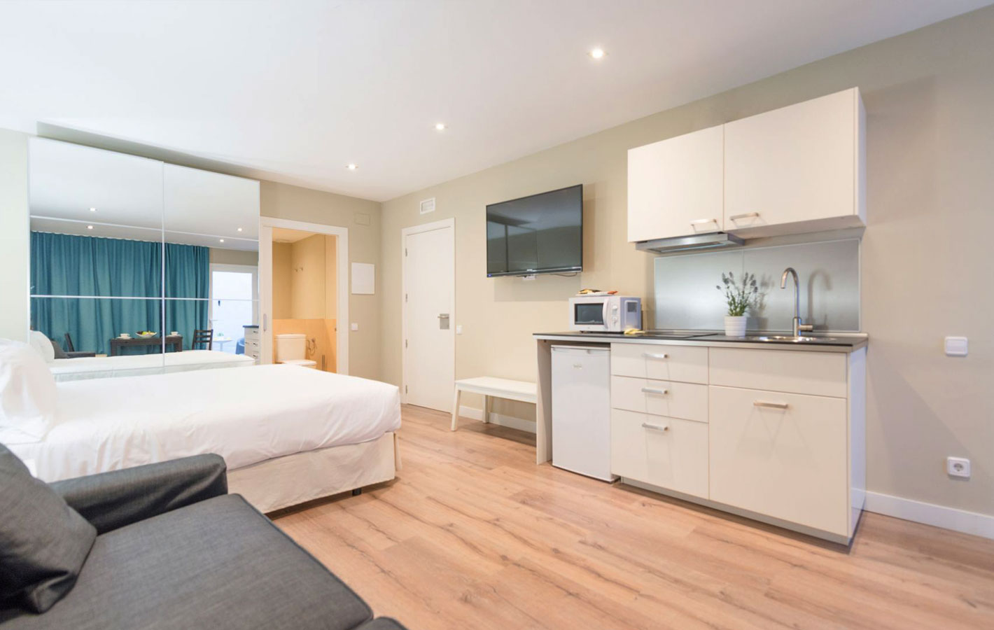 Nuestros apartamentos tipo estudio planta baja con capacidad para 4 personas son de interior y te ofrecen en un solo ambiente la comodidad de su cocina equipada, su confortable sofá desde donde puedes ver TV y un cómodo dormitorio comunicado con un baño completo de media bañera.