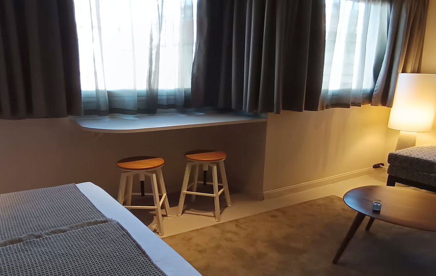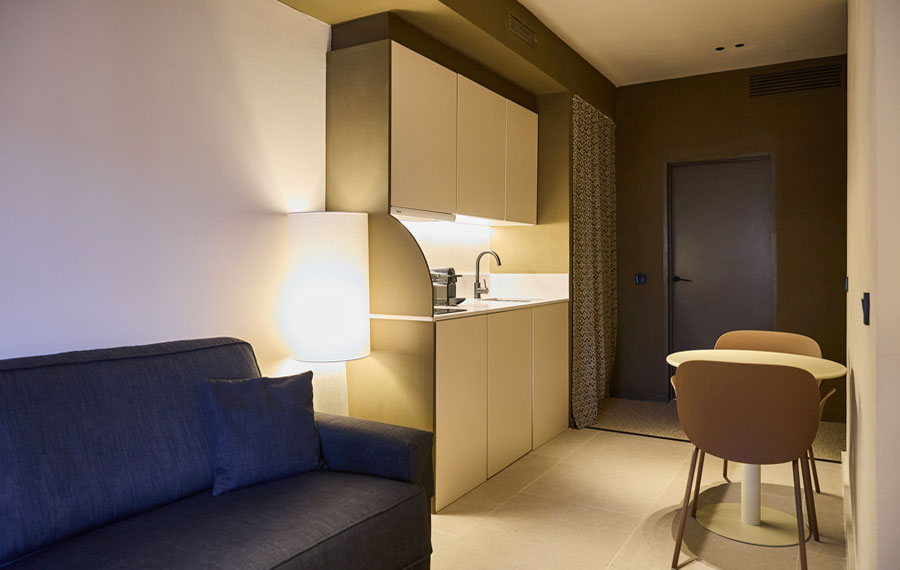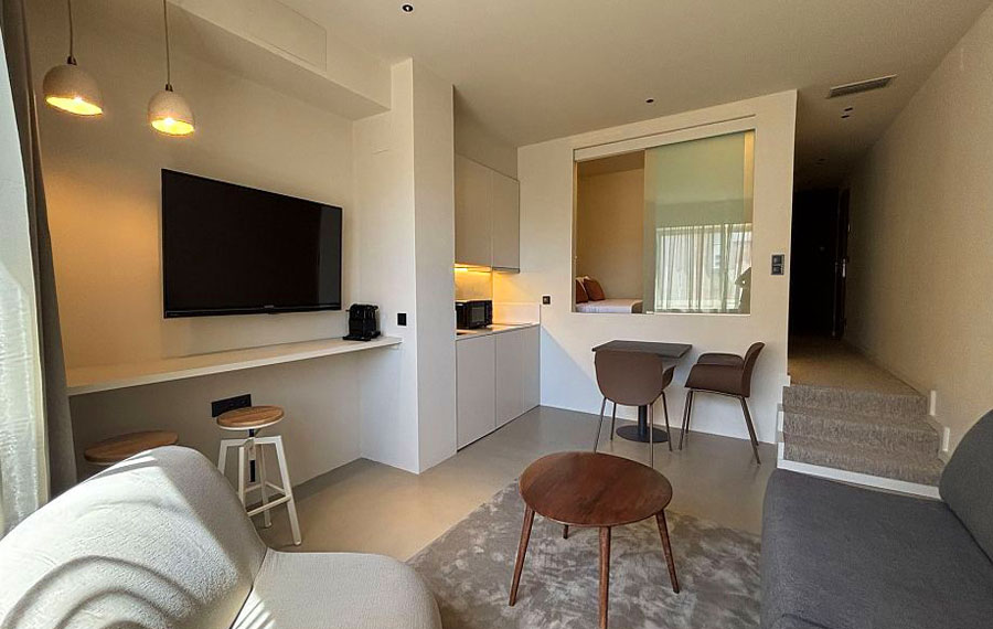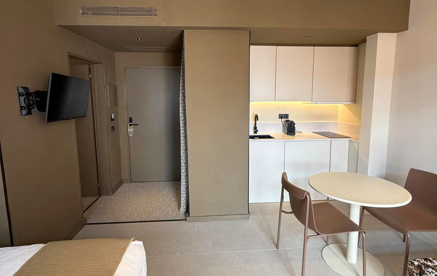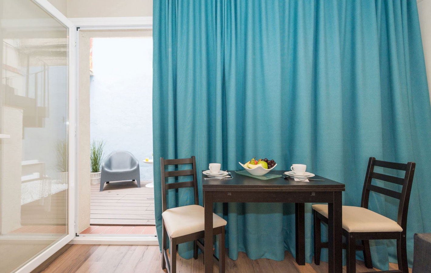 Nuestros apartamentos tipo estudio planta baja con capacidad para 4 personas son de interior y te ofrecen en un solo ambiente la comodidad de su cocina equipada, su confortable sofá desde donde puedes ver TV y un cómodo dormitorio comunicado con un baño completo de media bañera.