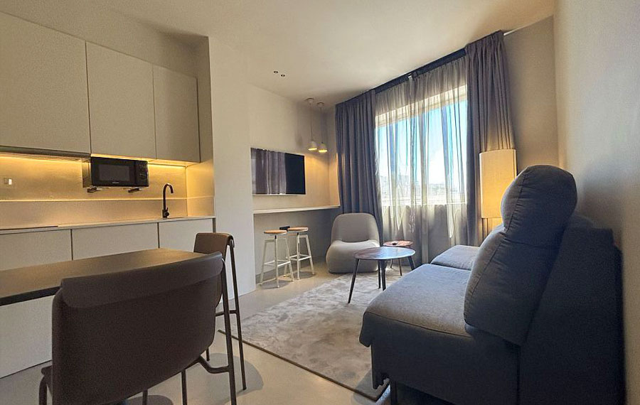 Nuestro renovado apartamento tipo estudio te ofrece en un solo ambiente la comodidad de su cocina equipada, su confortable sofá desde donde puedes ver su TV y un cómodo dormitorio, baño completo con ducha.