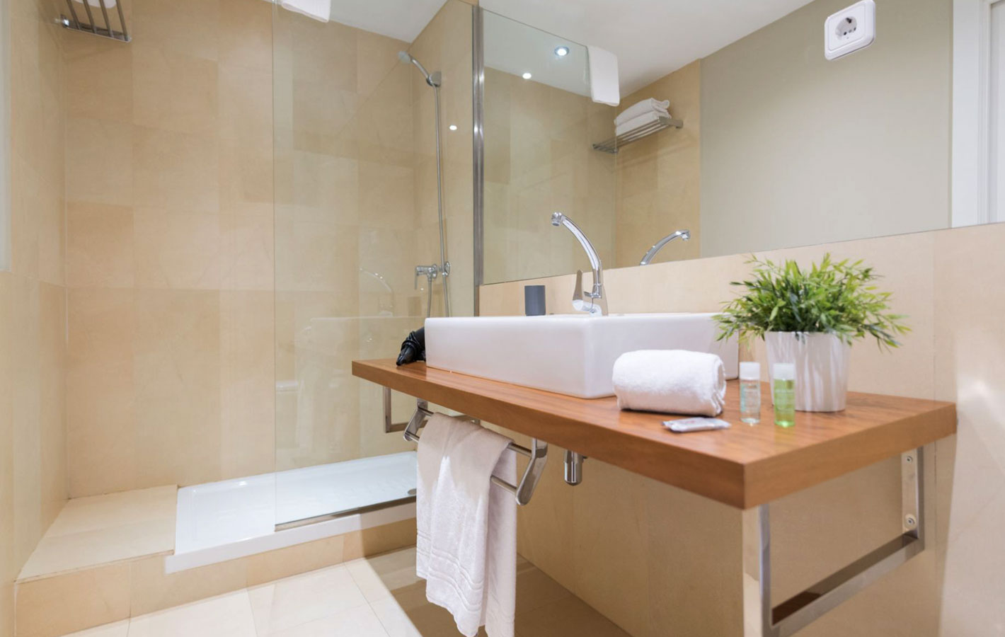 Nuestros apartamentos estándar tienen capacidad para 4 personas, ya bien sean adultos o adultos con niños. Tiene una habitación privada para 2 personas (2 camas individuales o 1 cama de matrimonio bajo petición) con armario empotrado y acceso directo al baño completo con media bañera. Salón con sofá cama, TV y cocina totalmente equipada con mesa para 4 personas. Se accede a ellos por ascensor.